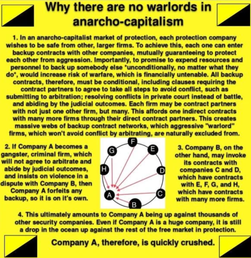 >>5721good luck! No state to protect you - I'll keep my M60 thank you very much. Also, the risks outweight the benefits! You need to understand incentives and economics to become an AnCap - if you only acknowledge the societal problems, you may fall towards degenerate socialism as NatSocs do. Assuming AnCap = no order is retarded, learn some basic AnCap beliefs before spewing out the most braindead statist propaganda ever. Who will they pillage? I have a private defense agency with a lot more resources and INCENTIVES than the police would ever have to defend me, I also have insurances and my own guns if the worst case scenario comes to be.