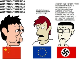 >>9894No, just a pvre bred ytboi. I understand what China is now, and it's certainly not communist. I am also dissatisfied with the west, as I have been lied to by everyone about everything. I no longer see an America of old that of which I long for coming back, and we are Rome. A Rome that is tearing itself apart and breaking down, and quickly losing it's influence of the world, most notably Western Europe, due to poor foreign policy, disastrous proxy wars, and the destruction of tradition, leading to a cultural rot in America and Europe. We can kid ourselves all we want, but the East, as of now, is winning this Cold War. Is China everything I want from the West? Fuck no, but I'll be damned if I become a Zigger militant Orthocuck or Iranian mudslime. Ba'athism was pretty appealing, but it's a DNB ideology and I'm not an Arab. China, out of the rest of the East, is the most successful, by far, and you know why. I'm not going to keep riding the dead NATSOC horse either, we can spam TND all day, but the political, social, and armed power of the far-right is so small (compared to major powers and armed groups) in reach, it would take a 9/11 level of terror to reach marjor international attention, and then they would be given the al-Qaida treatment, and be BTFO. And people have become so Zogged that they wouldn't be winning over hearts and minds. Besides, most of the groups are Satanic and filled with glowniggers. I loath the modern left, easy enough. It's not that I want to do this but its either be Xi Xin Ping's strongest soldier, or live a delusional life in a late Roman Republic. Call me a commie, chink or kike, I'm none of those, I just see how things are now. TKD, TND, and TTD are awesome though, and China is actually quite socially conservative, unlike Taiwan. Chang Kai Shek would be disapointed, glory to the CCP I guess.