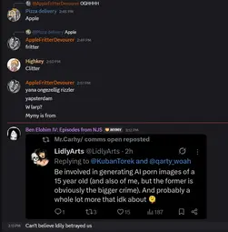 >lidly left? why?<oh it's those evil zartysharties they ai'd porn of her and gooned to her and said they wanted to rape her>ah yes makes sense that's something we except of them because of the weird fantastical strawman we keep perpetuating about themI've been a spy in massacord for a couple years now I never open the app doe I'll check out if they say this exact thing
