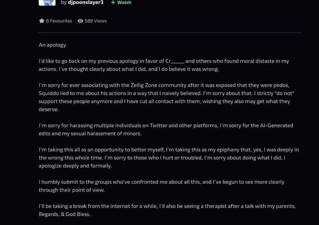 >>28357posting ai csam of carhy(yurifag) would be fucked up besides DJP even admitted to it in his newest apology in which he says he’s going to get psychiatric help