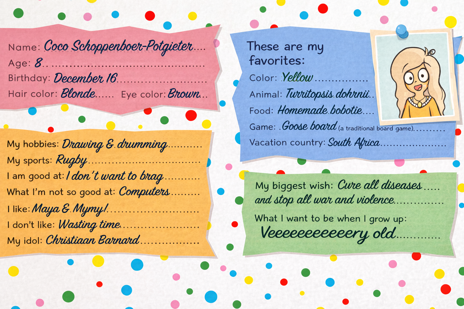 Change her animal to something more realistic, as with all of the animals in South Africa, I doubt a child would pick something as ugly as a jellyfish. Change what she wants to be to something like a nurse or a vet, which shows she's always liked helping people (which is realistic!!!)