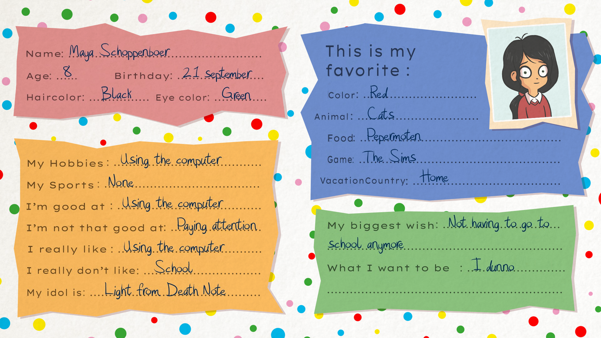 overall, these friendbooks (and Maya's Sweet 16 in general) are trying way too hard to build sympathy and intrigue, but did in such an on the nose way, it makes the characters feel fake. It doesn't feel like I am reading the friend book of a real child with real thoughts, feelings, and desires. It feels like I'm reading from the script of Amazing Digital Circus with how unsubtle everything is.