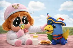 Unlike Mymy, Agugu actually has natural orange hair and blue eyes. She likes sweets, binkies and Kapitein Koek. She can often be seen acting selfish, but she actually has a chill and easy-going personality. Throughout the show she learns about sharing and being considerate. She swears that she is able to fly by putting her bowtie on top of her head and flapping it, but she can't prove it, because it seems to only work when she's in her crib and no one else is around. Her real name is Agustina, Agugu is her baby-name.