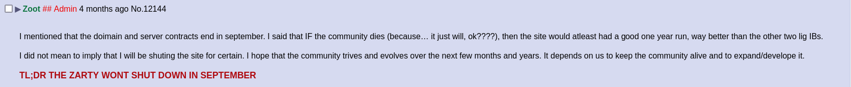 It’s been almost two years since I began this website, and for that period, I’ve been your admin. I know that the zarty has had its ups and downs, but no matter how you feel about it, my time as your admin has come to an end. I feel really conflicted by doing this, but I feel that circumstances in my life have made it impossible for me to maintain this website to a good standard. You may have noticed that moderation quality has been subpar, and I have to say that I am probably responsible for much of it due to my neglect. I haven’t been able to invest as much time as I would have hoped, and seeing the website in this state during my absence and neglect is nothing short of disheartening.