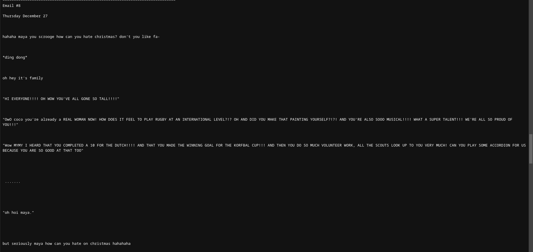 Reading this character exploration teases me so much. Reading the mails made me realize again how much potential Ongezellig has as a show. We mostly know about Maya and even then the full extent of her character isn't known. As for Mymy and Coco we know little about them. All their characters and relations could be explored so much. Beyond characters, the themes of Ongezellig have so much to offer. I really hope that there is a chance for Ongezellig in the future because this story is just too fascinating and socially relevant in society for it to remain in its current dormant state.