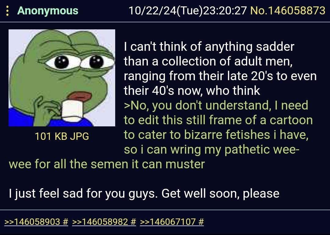 >>44512>whuat if you are 20-40s old male you should be wagieslaving away instead of enjoying your life, hobbies and creative pursuits.Bluepilled Frogcuck anti-male bullshit fail.