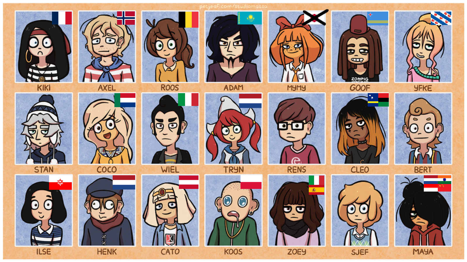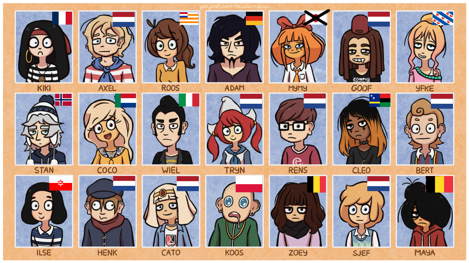 Roos is Belgian, Adam is a chink, Axel is either a Kraut or Nordic, Cato is Italian from South Tyrol (probably larping as Egyptian). Zoey is also probably a mix between Mediterranean Italian or Spanish origin. Others are just too much of a background characters for me to give a fuck.