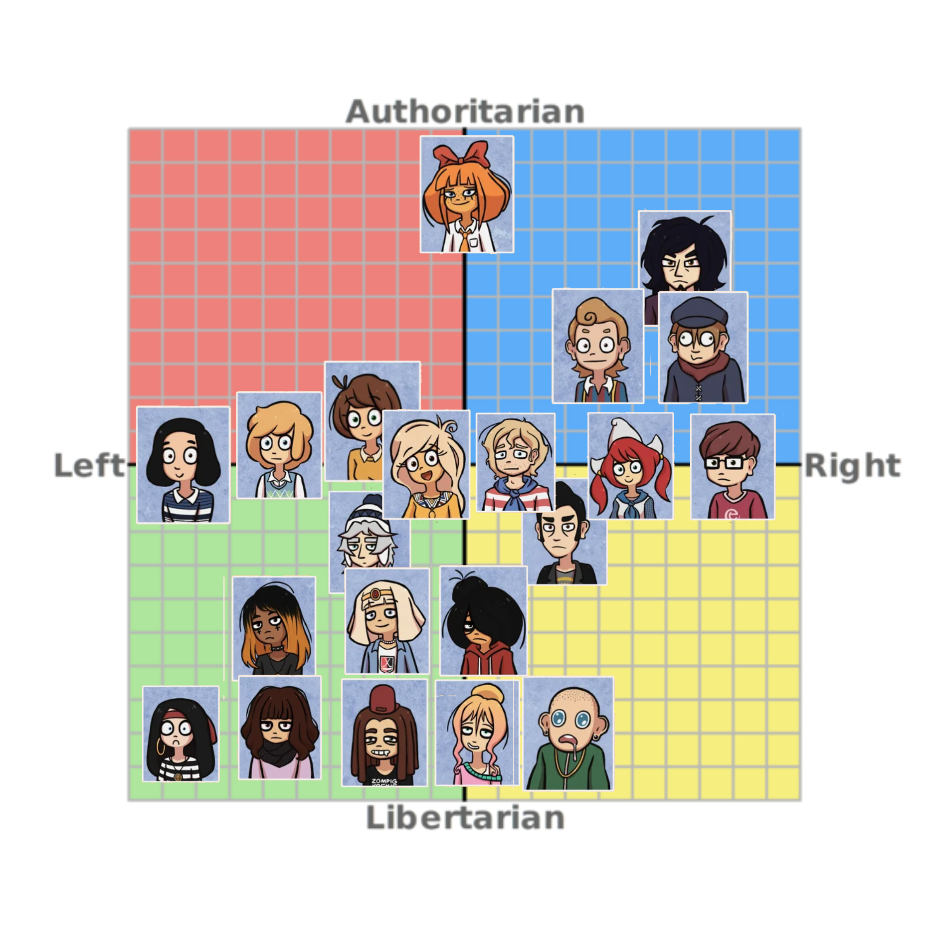 The 60s was known for everything leftlibs adore. Cleo is black which naturally puts her somewhere in the green corner as well, but the Y axis is more tricky. On one hand she’d hate police and would likely support BLM, but on the other hand she does strike me as a wannabe commie. So I’m unsure about this one. Next up is Zoey. She looks like she’d be the most authoritarian (but still left) out of the group. However, I think actually political people would scare Coco off. Coco is most likely to be friends with apolitical stoic hippies than people who actually give a fuck about politics. Also I think only Zoey and Cleo would vote